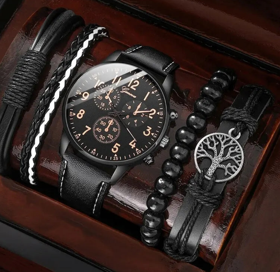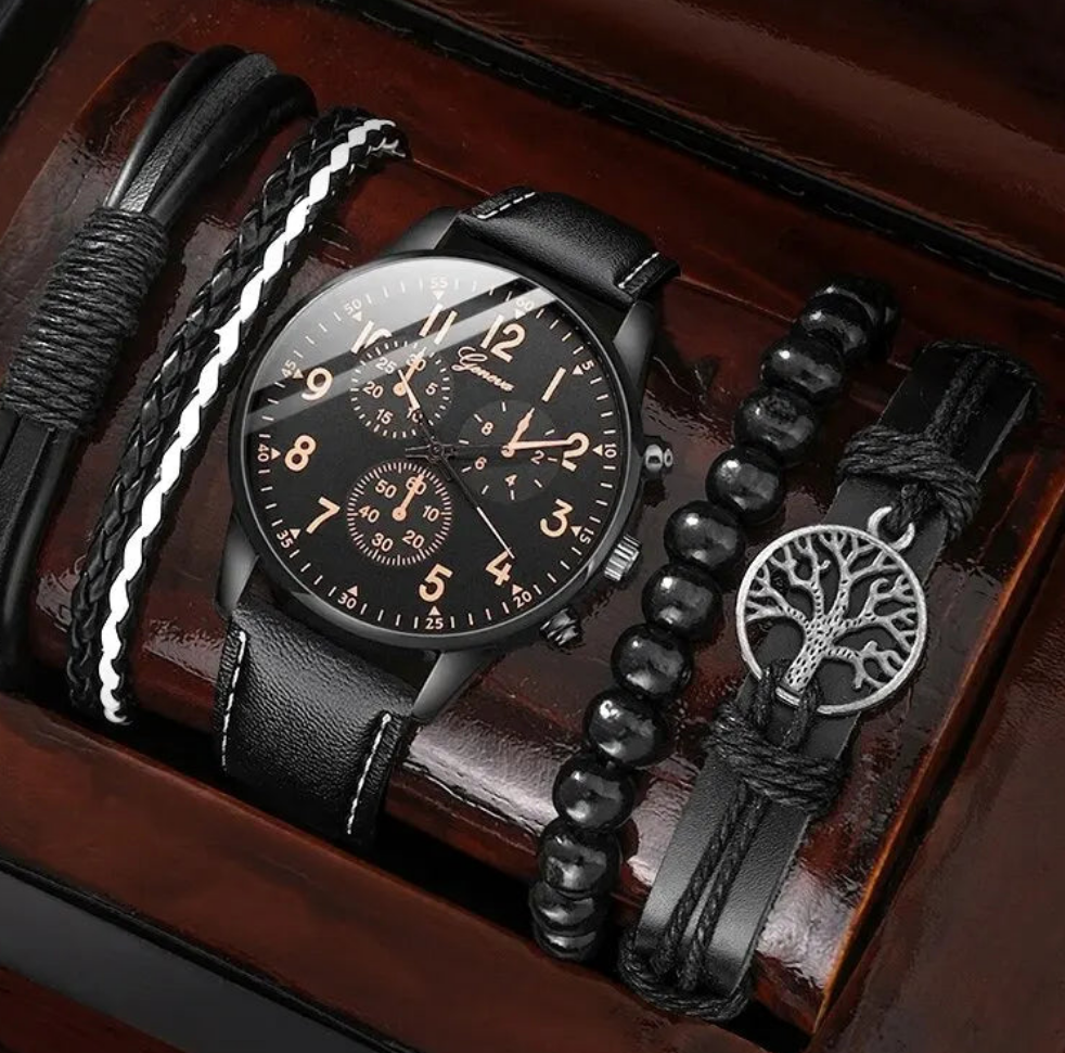 ¡Set de 5 piezas para hombre: 1 reloj estilo cronógrafo de cuarzo + 4 pulseras estilo casual chic! (Color negro/Envío GRATIS)